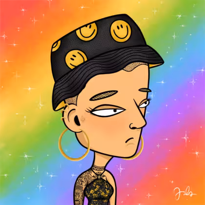Collection Depressed Citizens Artist Juls Description ART. No team, no project, no future. Depressed Citizens is an urban & existential Art expression on Ordinals. In a parallel universe, "THEI" control us. DC unites against toxic society, encouraging critical thinking. 100% hand made collection that took Juls more than 6 months of daily work. Name Citizen#1062 Origin LGBT-Q+ Gender Non-binary Necklace No Necklace Hat Smiley bucket hat Mustache Beard No beard Glasses No Glasses Earrings Helix ring trio Hair Style Shaved head Clothes Golden black halterneck top Tattoo Maya tattoo Star Background With stars